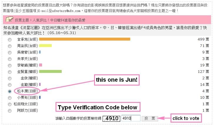 If you have a few seconds every day from now until May 31, please try to visit http://mag.udn.com/mag/stars/udnvote_result.jsp?f_VOTE_ID=1729 to vote for Jun as your favorite actor of an F4 character from the 3 versions (Taiwan, Korea, Japan).